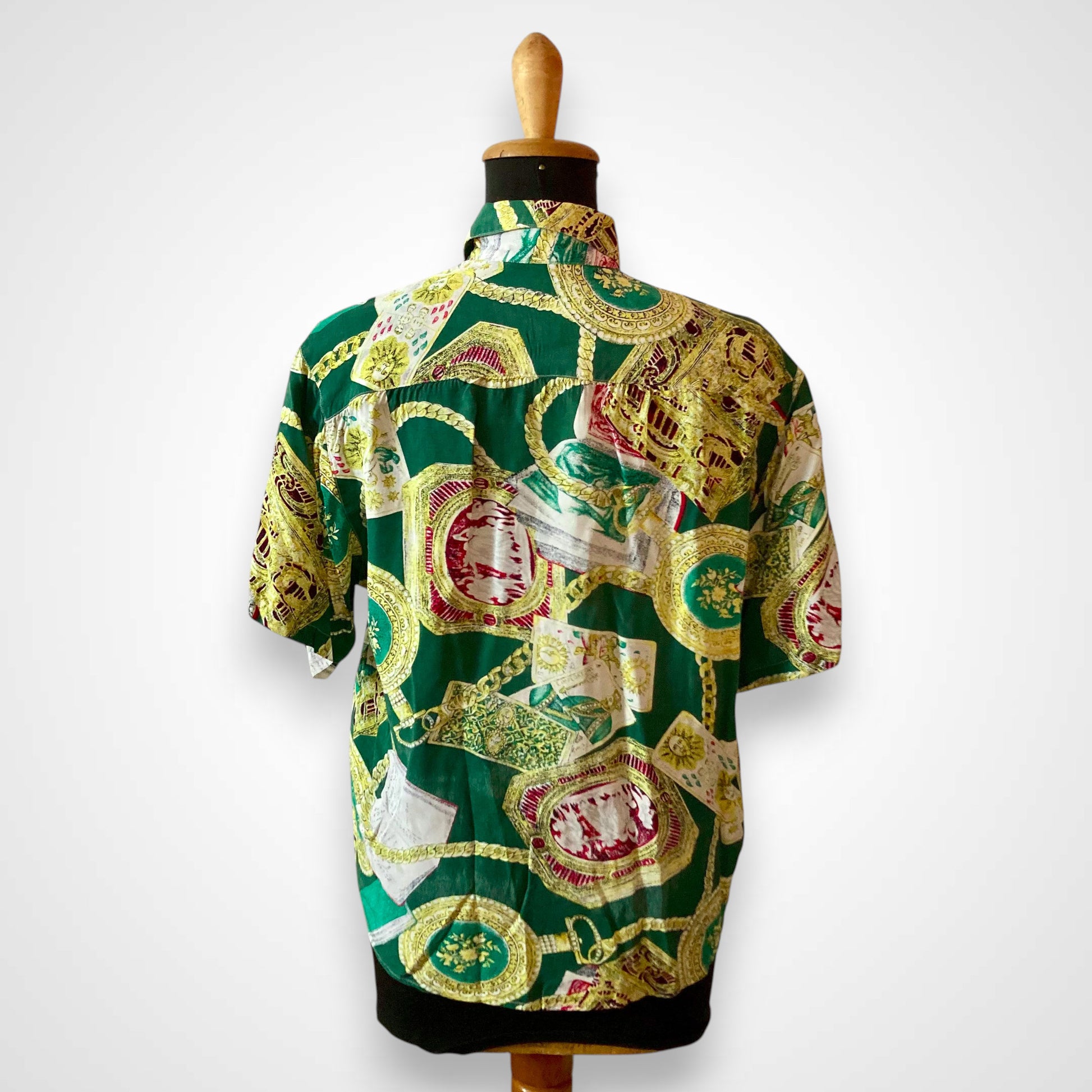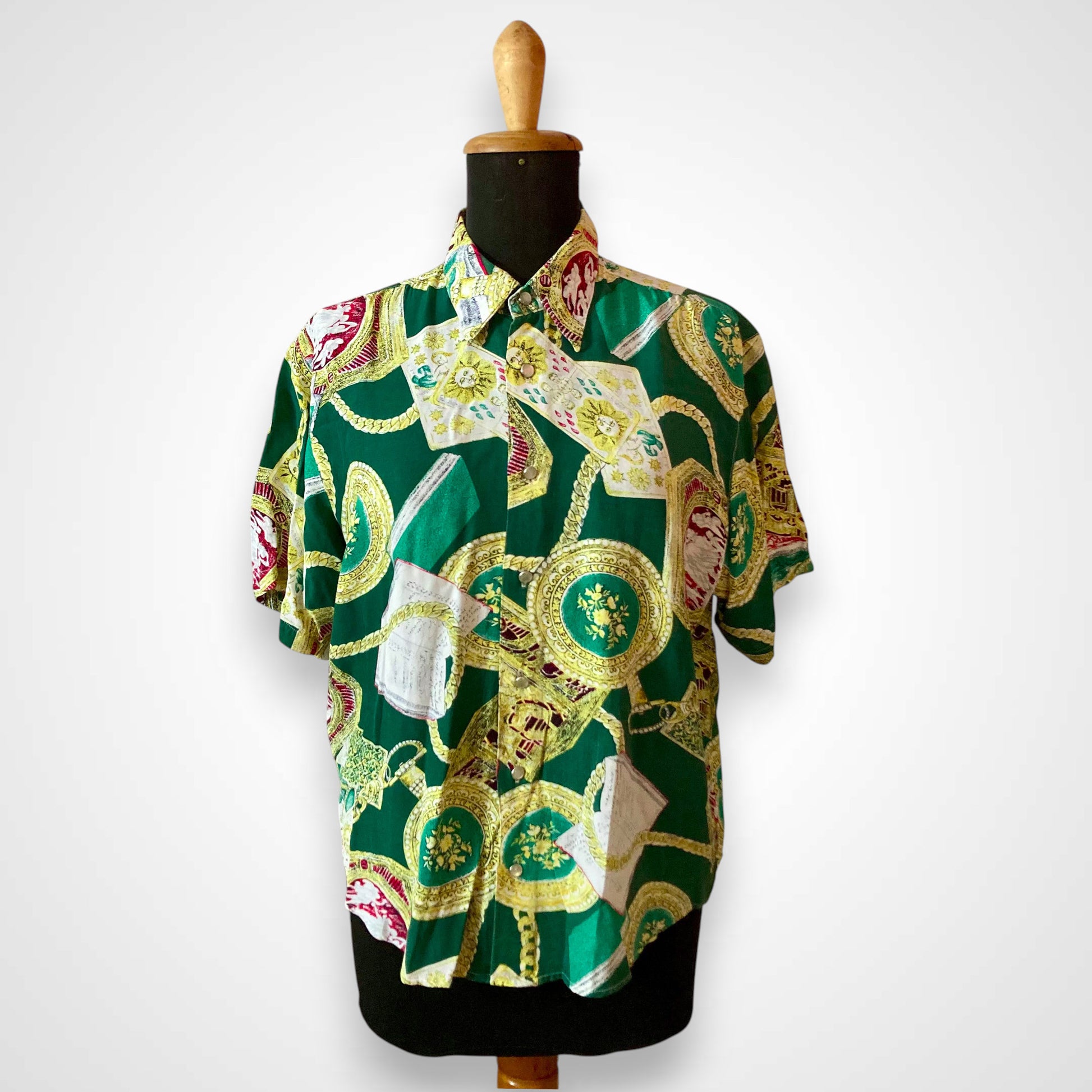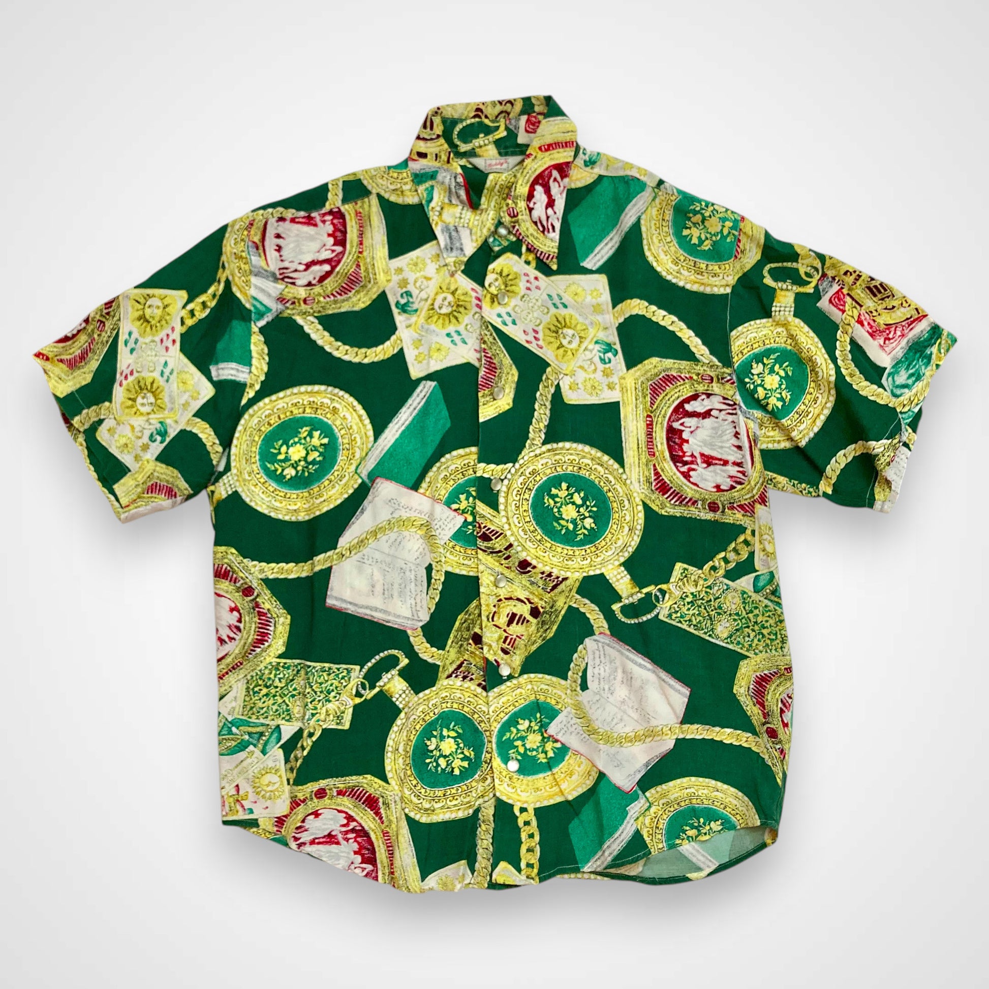 Questa camicia Teddy’s è il manifesto dello stile stravagante degli anni novanta. Caratterizzata da una base verde smeraldo intenso, presenta una stampa all-over di ispirazione barocca con medaglioni, catene dorate, tarocchi e motivi classici.