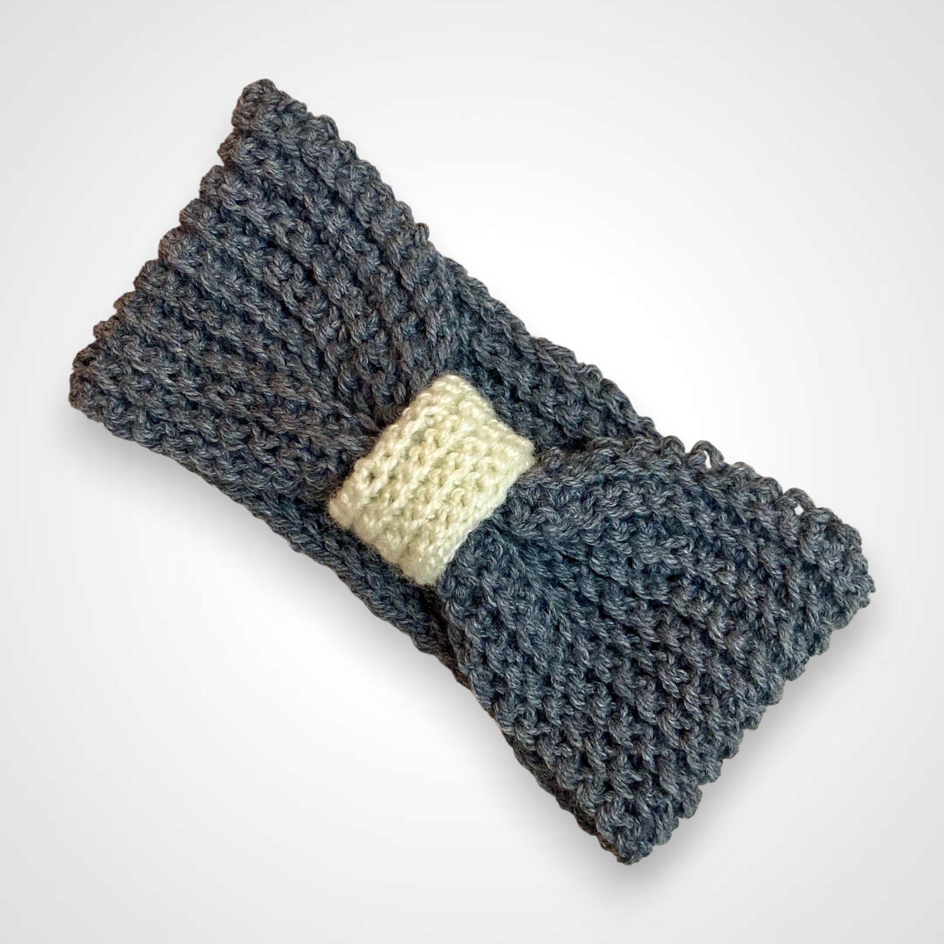 Fascia invernale con nodo e torsione, prodotta all'uncinetto e con filati riciclati.