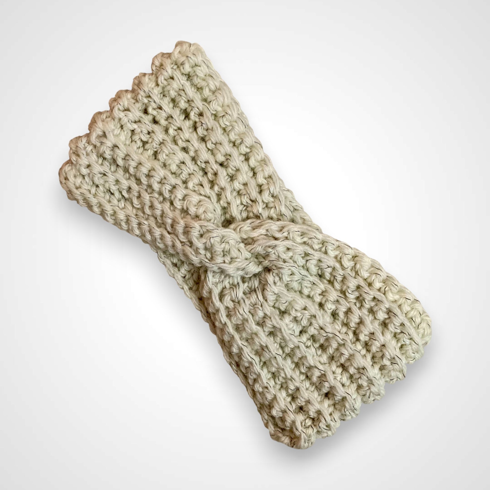 Fascia invernale con motivo intrecciato, prodotta all'uncinetto e con filati riciclati.