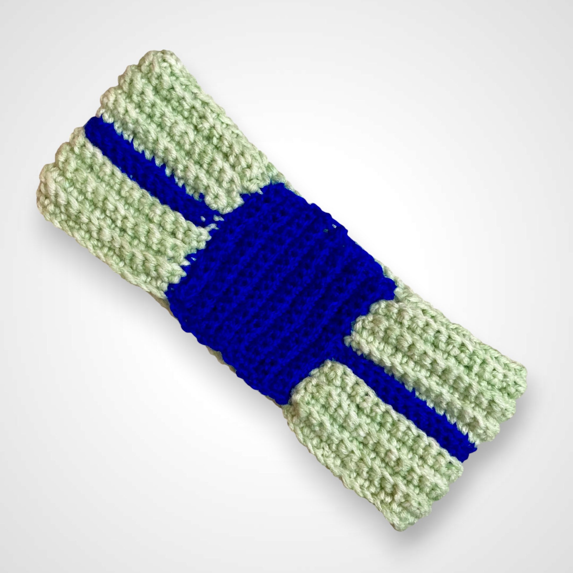 Fascia invernale con motivo lineare, prodotta all'uncinetto e con filati riciclati.