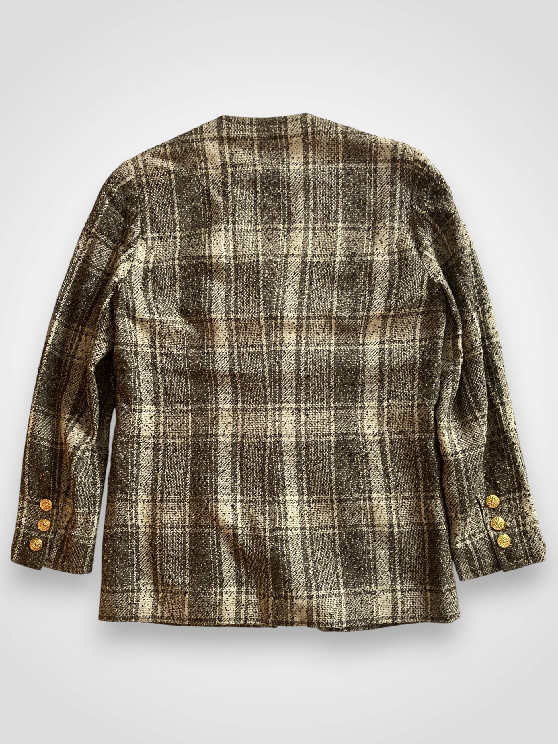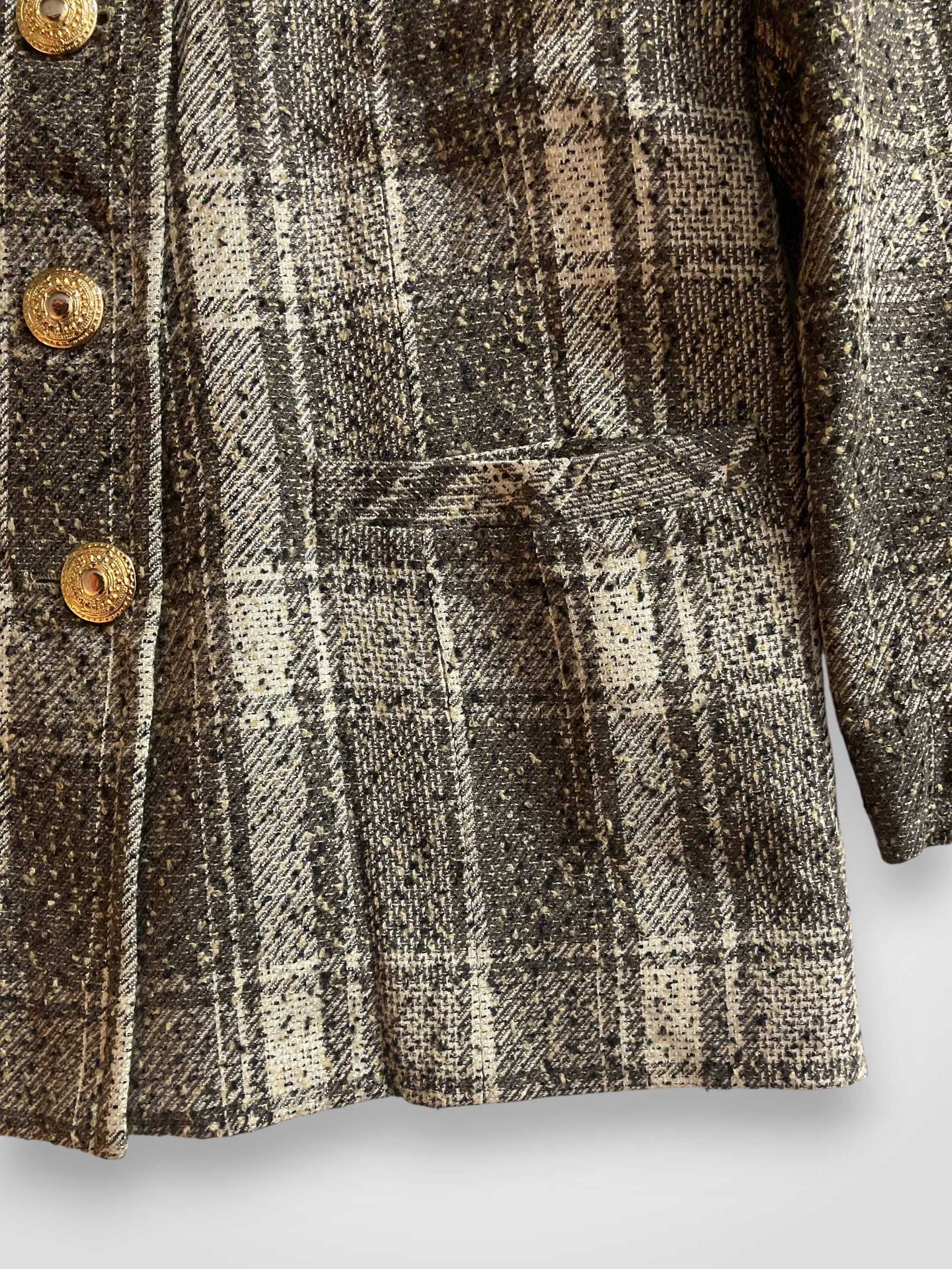 Blazer originale Hannezo Paris anni ’80, realizzato in pregiata maglia di lana con un'elegante trama a quadri panna e marrone. Un capo autentico, raffinato e di alta qualità prodotto in Francia, impreziosito dai tipici bottoni dorati decorati che donano un tocco di luce e prestigio. Ideale per chi ama lo stile vintage sofisticato, perfetto da abbinare a pantaloni a sigaretta o sopra un abito per un look power dressing d'ispirazione parigina.