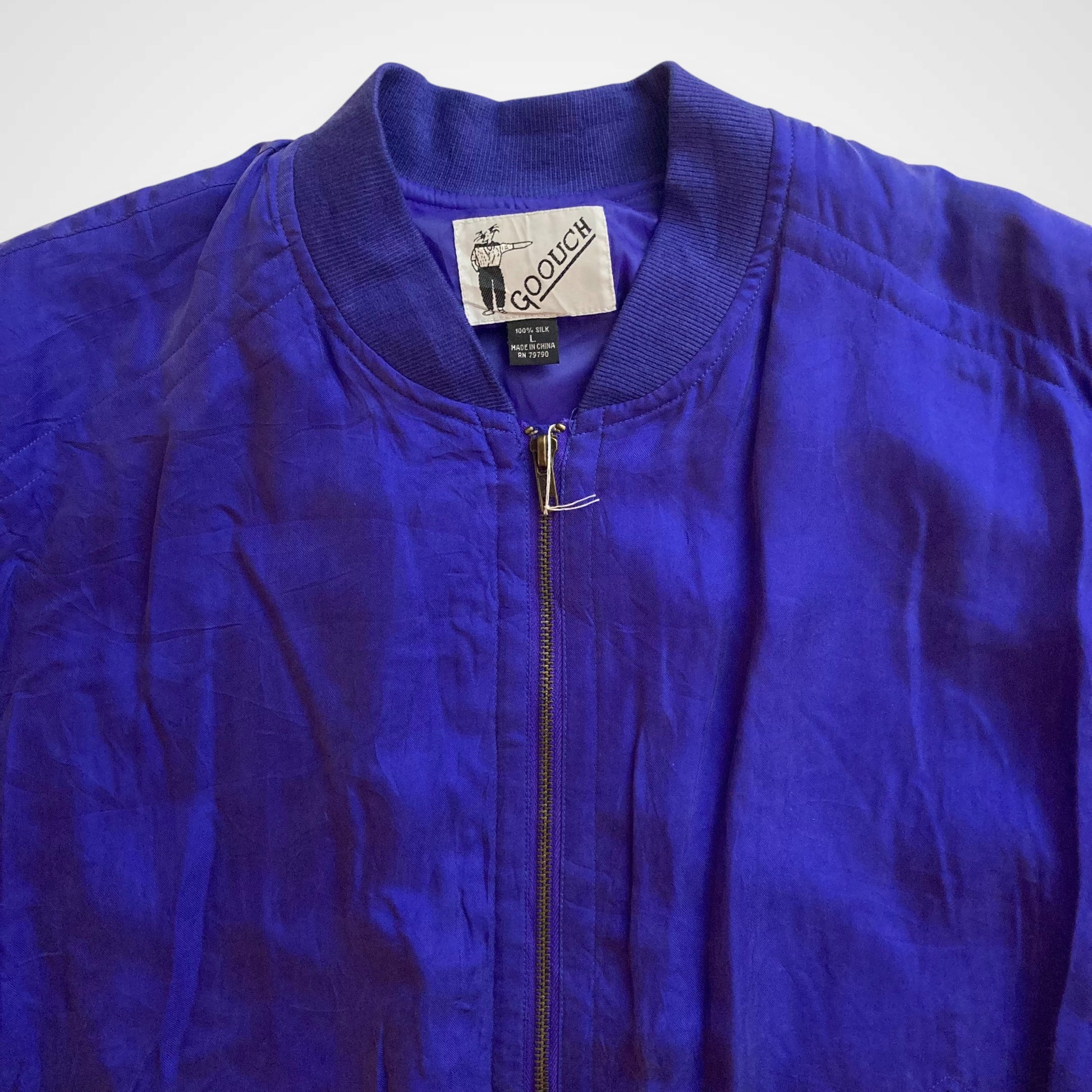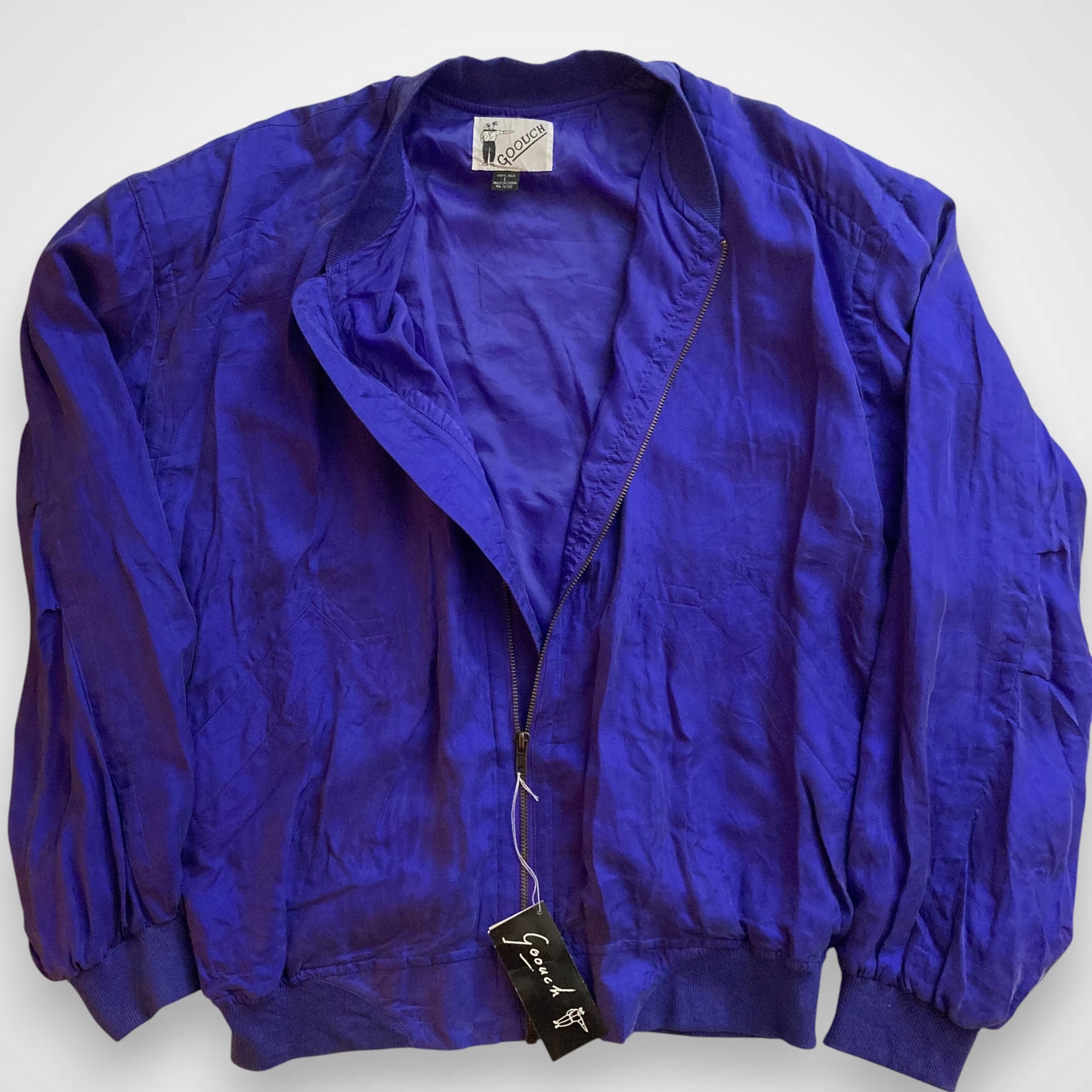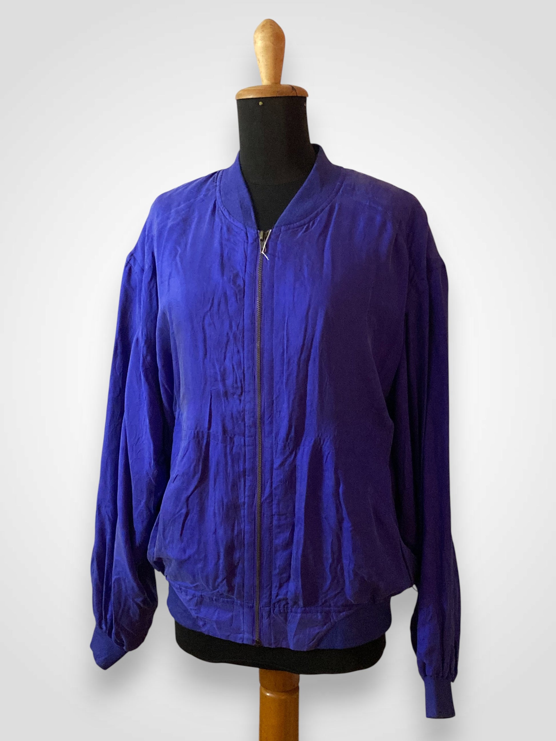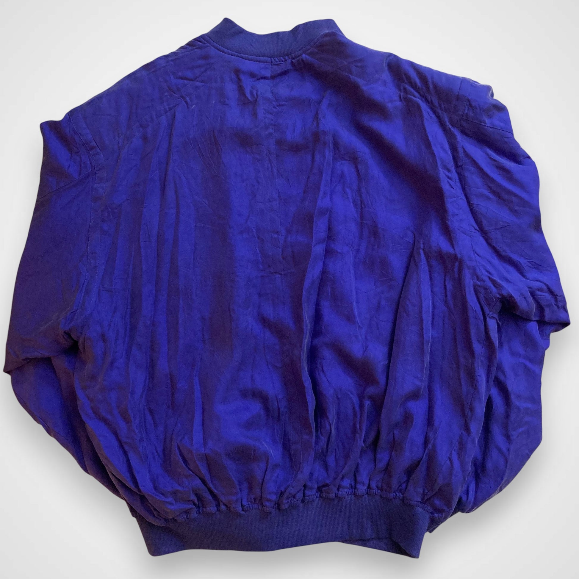 Questo bomber realizzato in 100% seta intrecciata è un capo unico nel suo genere e appartiene ad una collezione di giacche prodotte negli anni '80. Ha una vestibilità oversize tipica del periodo, con spalle calanti. È inoltre un articolo new-old-stock, in quanto, presenta ancora il cartellino originale (vedi ultima foto). Presenta spalline interne, chiusura con zip e tasche esterne ancora da scucire. Il tessuto del colletto, dei polsini e della balza in fondo sono in cotone a costine. Articolo unisex.