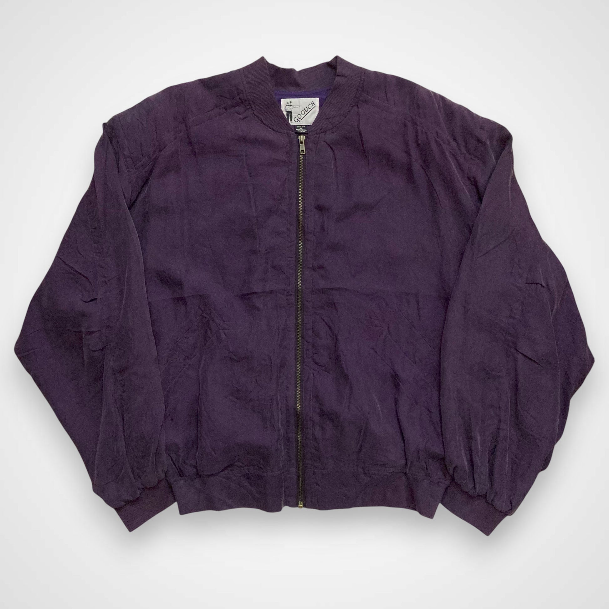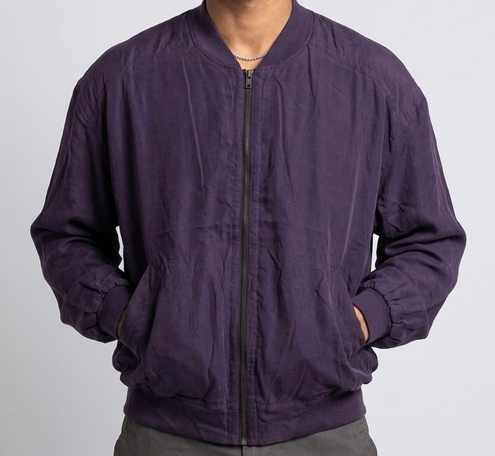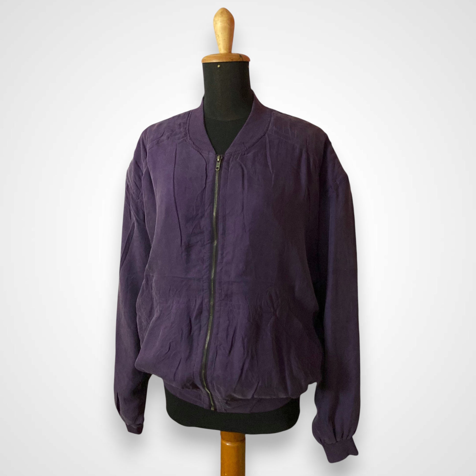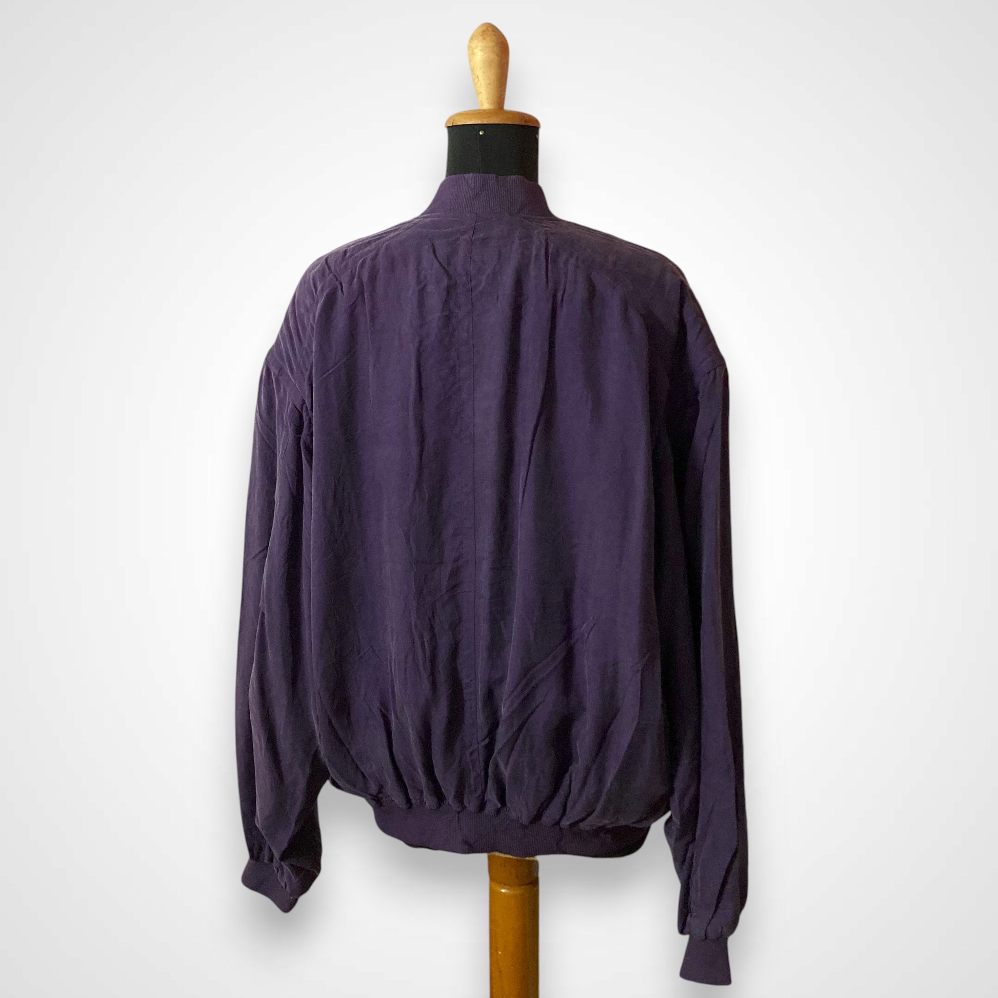 Questo bomber realizzato in 100% seta intrecciata è un capo unico nel suo genere e appartiene ad una collezione di giacche prodotta negli anni '80. Ha una vestibilità oversize tipica del periodo, con spalle calanti. Presenta spalline interne, chiusura con zip e tasche esterne ancora da scucire. Il tessuto del colletto, dei polsini e della balza in fondo sono in cotone a costine. Articolo unisex.