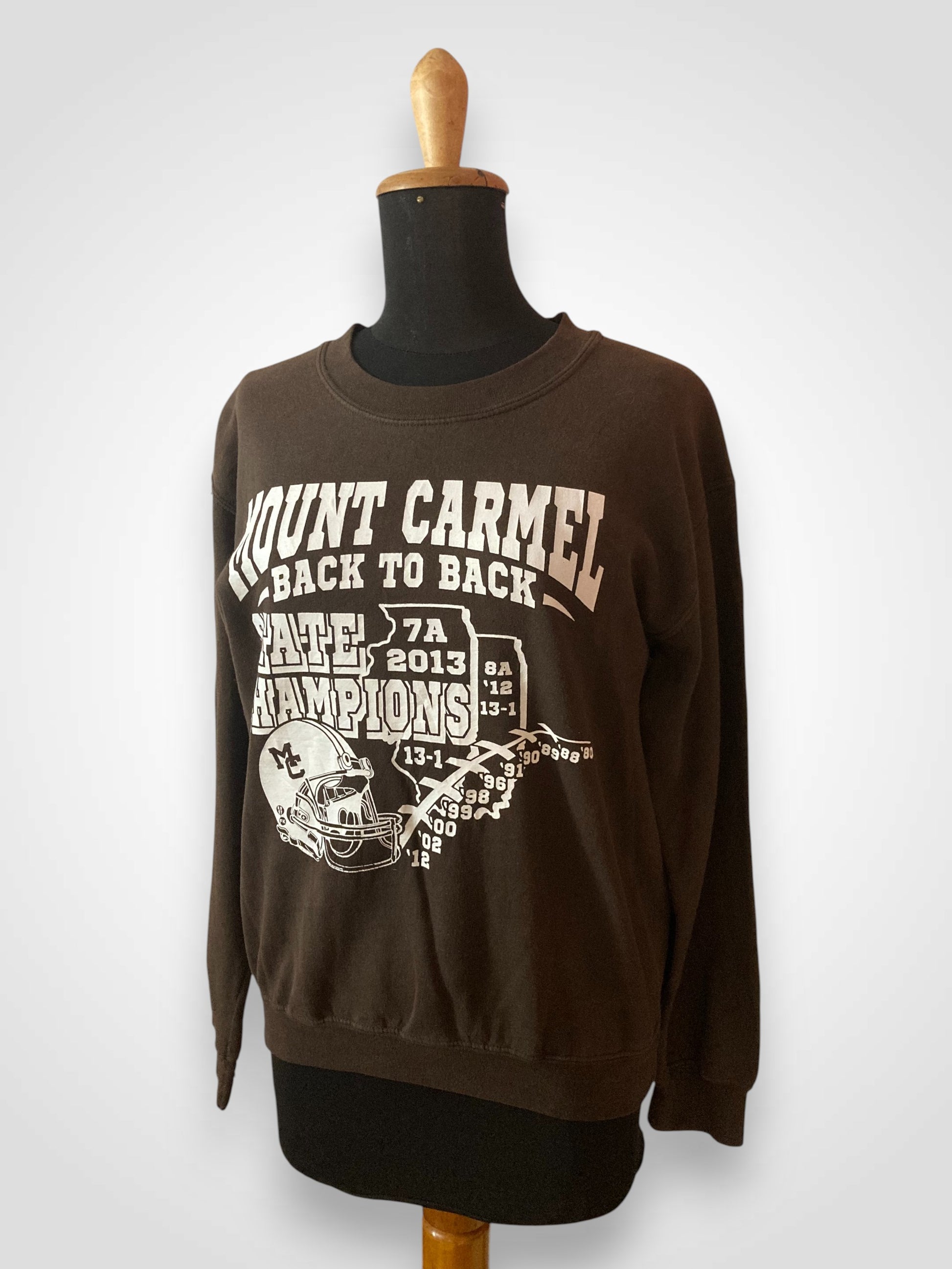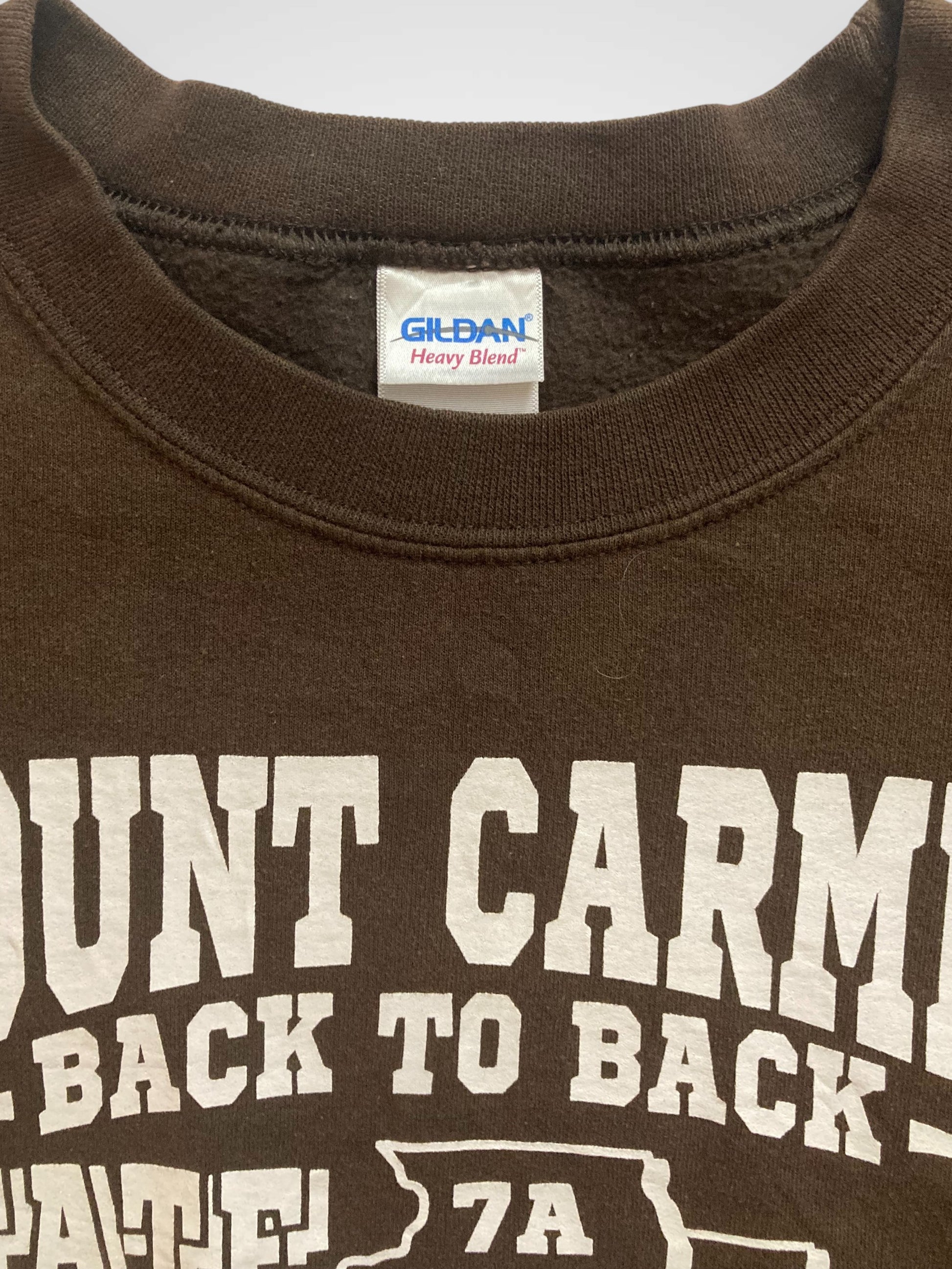 Felpa originale Gildan dal gusto retrò, realizzata in un confortevole mix di cotone e poliestere. Un capo autentico e resistente, caratterizzato dalla grafica sportiva frontale "Mount Carmel Back to Back State Champions".