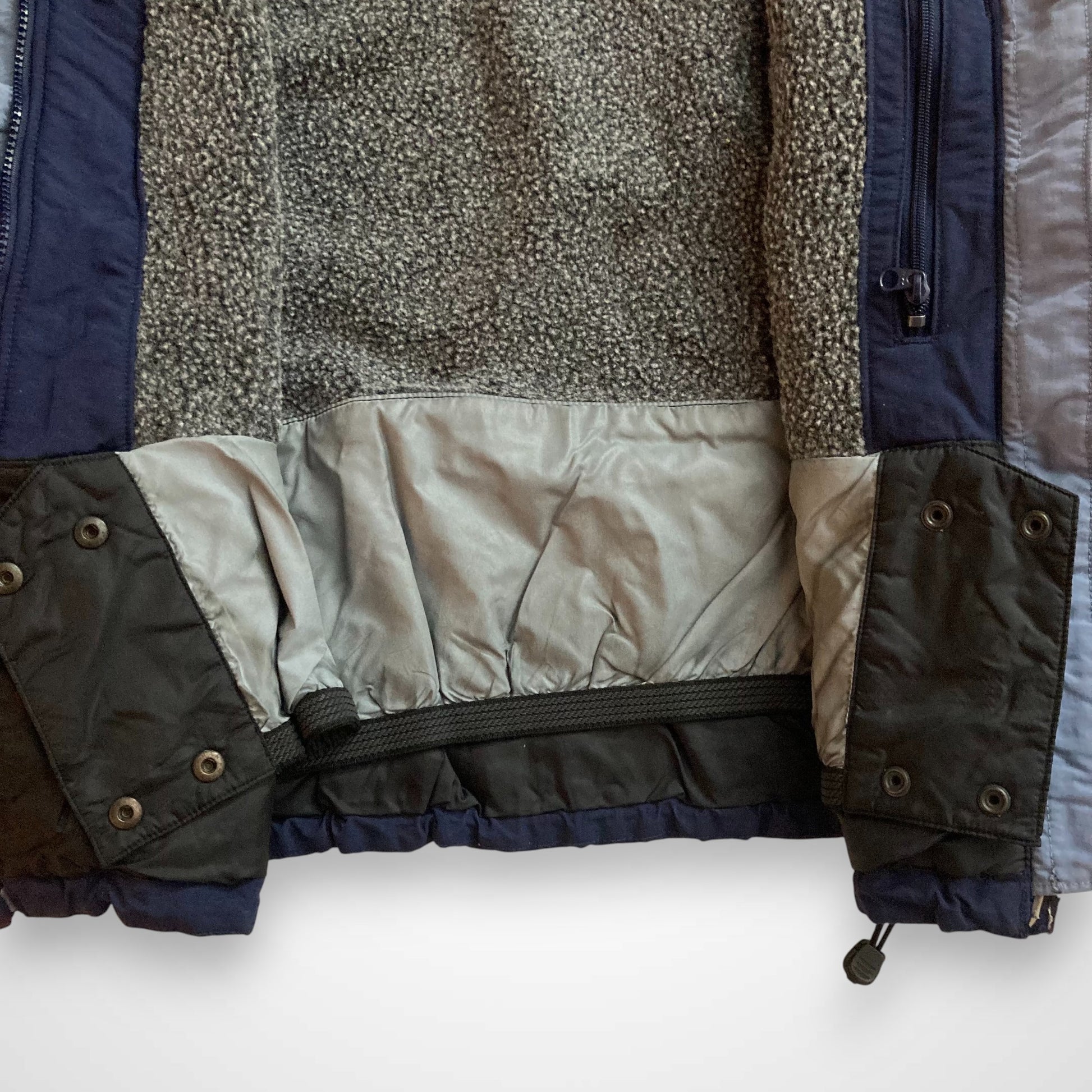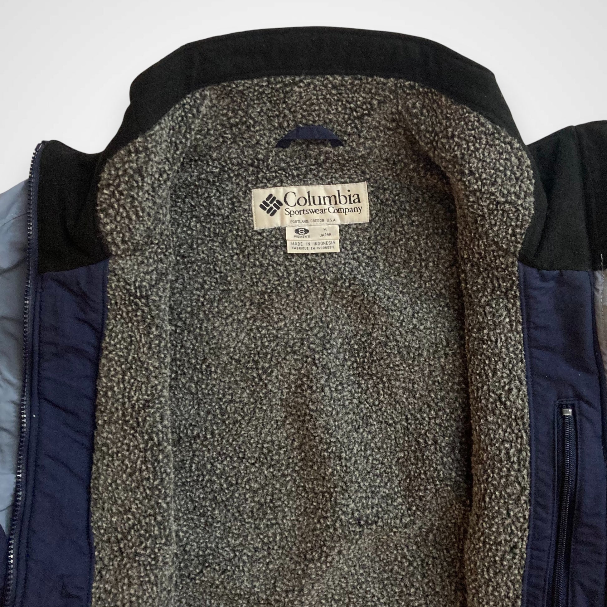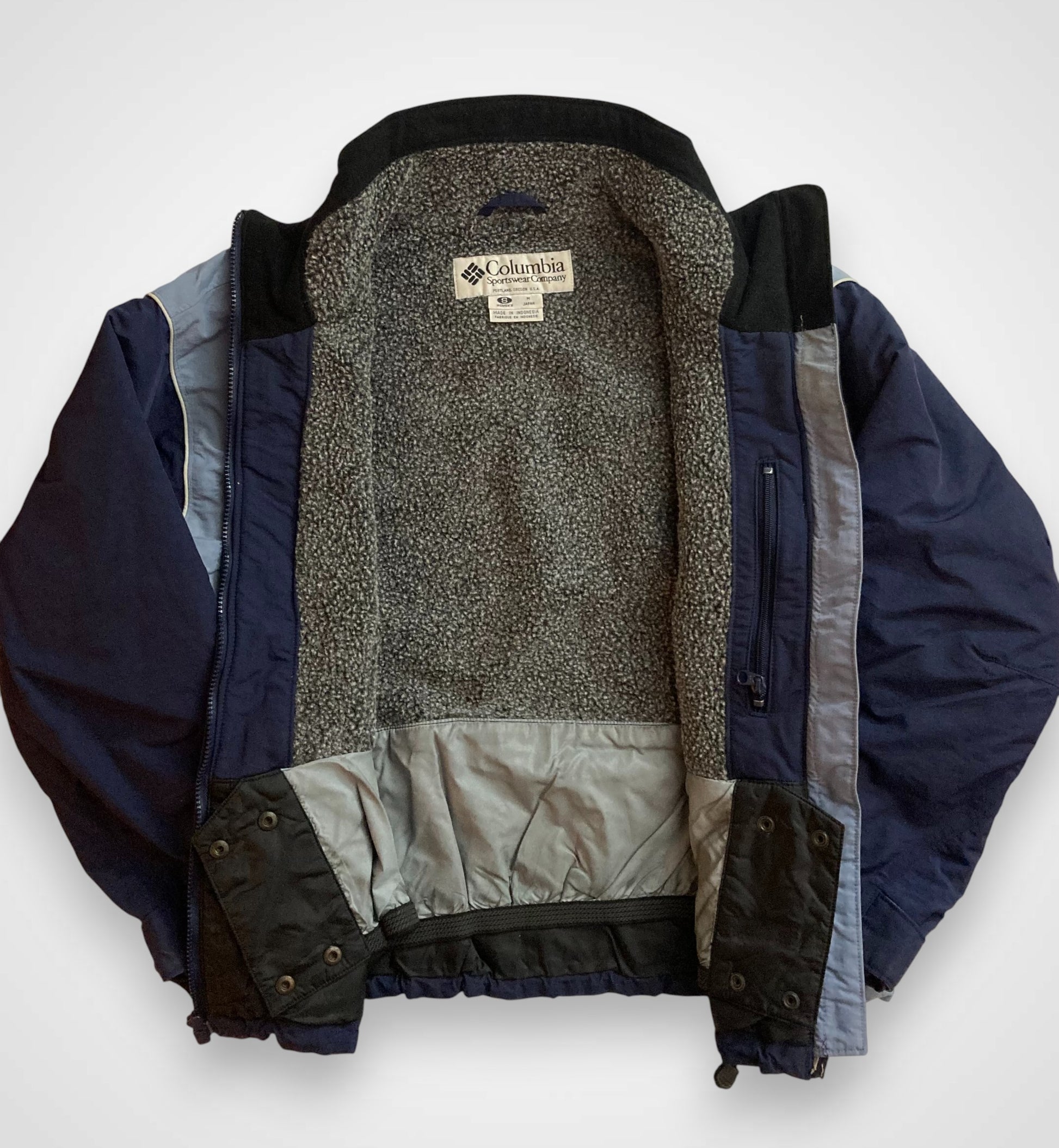 Giacca tecnica originale Columbia Sportswear, realizzata in un dinamico design multicolore sui toni del blu e dell'azzurro. Un capo autentico degli anni '90, caldo e funzionale grazie all'interno foderato in morbido pile grigio.