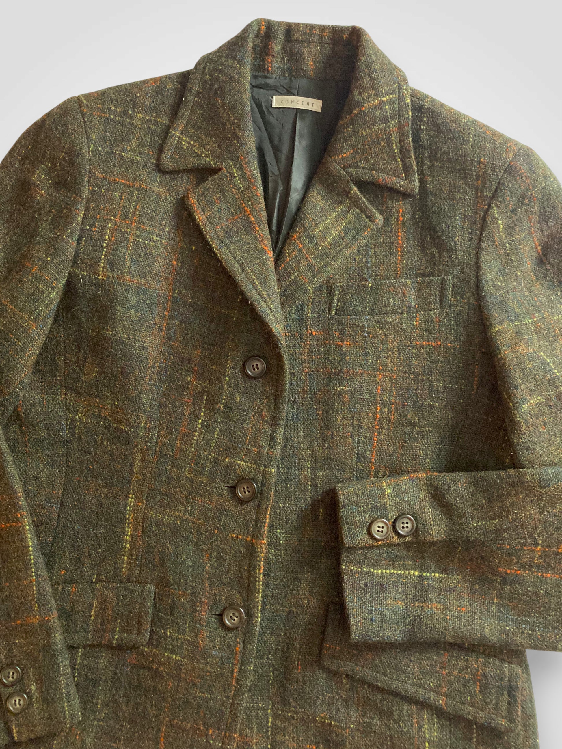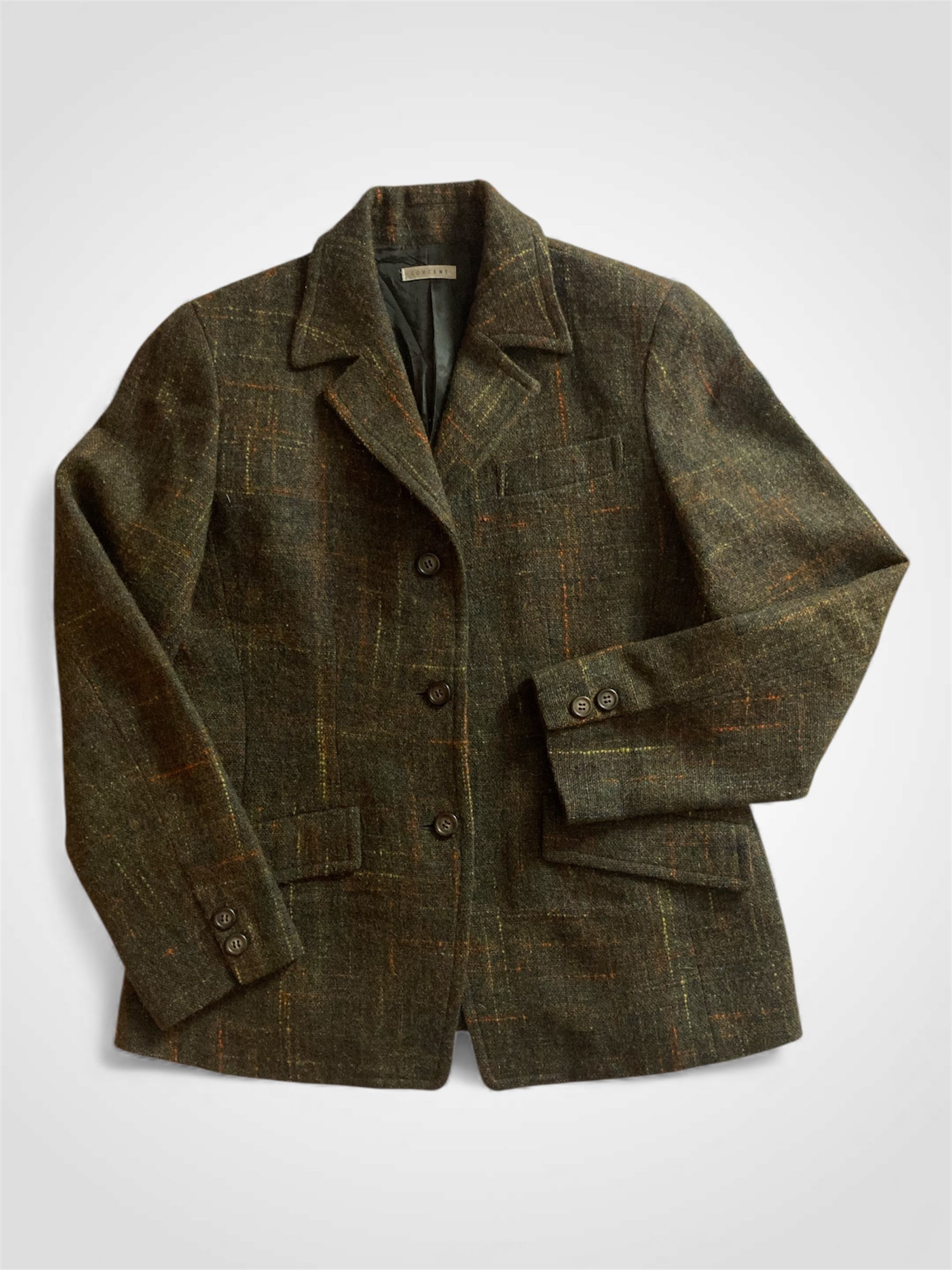 Blazer originale Concent anni ’90, realizzato in pregiata lana al 100% color verde bosco con una delicata trama a quadri. Un capo autentico, caldo e strutturato, ideale per chi ama lo stile vintage. Perfetto da abbinare a jeans a vita alta, pantaloni sartoriali o per completare outfit casual invernali dal tocco sofisticato.