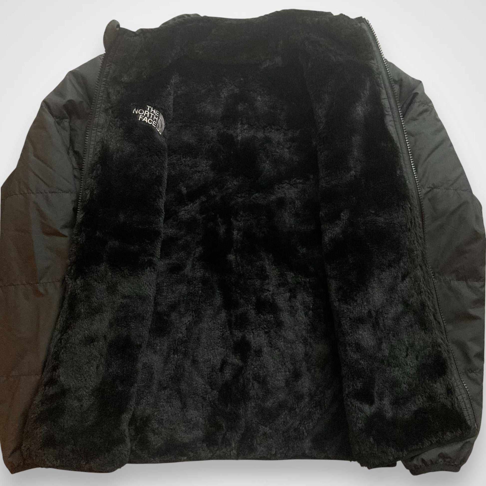 Lato B (Comfort): Presenta una fodera in pile a pelo alto (Sherpa o High-Pile) di colore nero. Questo lato è estremamente morbido al tatto e serve a trattenere il calore corporeo, rendendo il giubbotto molto caldo nonostante il peso ridotto.